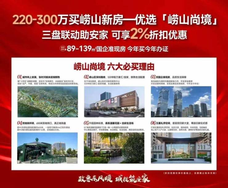 最后我们再看看商业配套!对于喜欢热闹爱逛街的人来说,崂山尚境优势明显。乘坐地铁2号线仅需1站崂山万象汇、4站金狮广场、3站李沧的乐客城,购物休闲、吃喝玩乐一站满足!