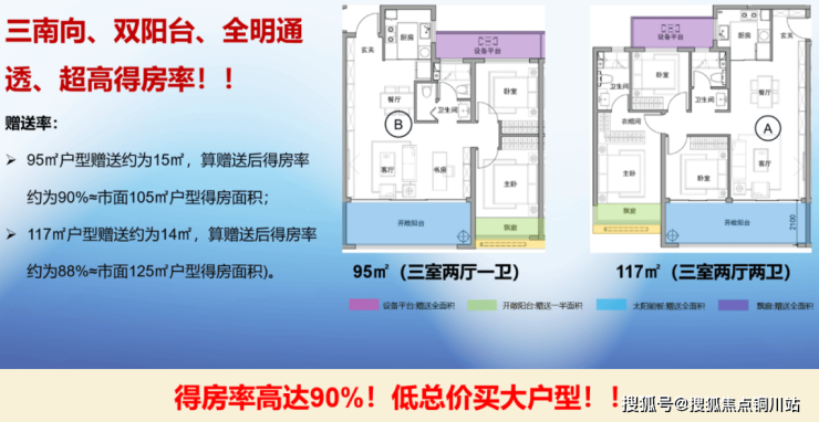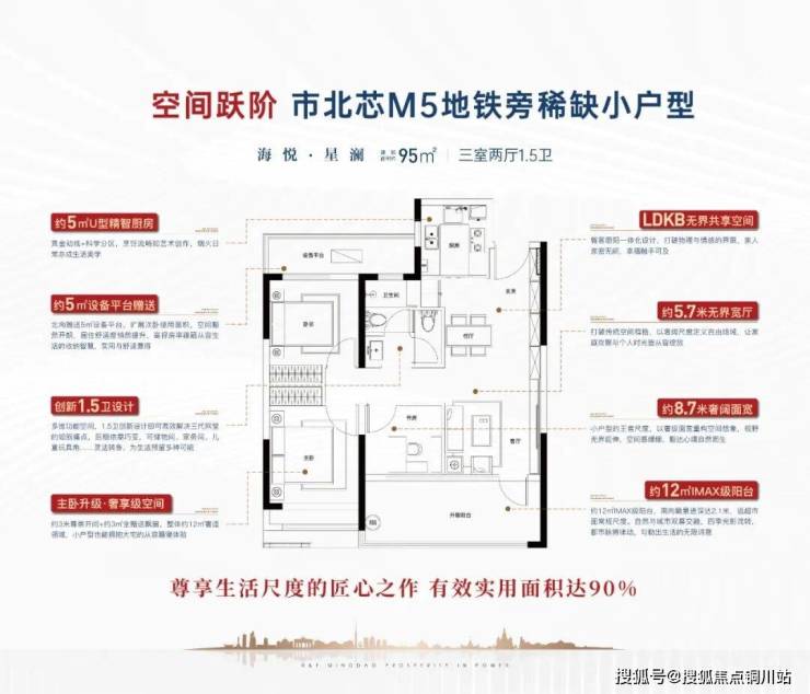 经典的三开间超南布局,套三1.5卫设计,不仅通过LDBK一体化设计实现了完整的超大室内公区,而且还有南向进深约2.1米宽约5.7米长的双联跑道式大阳台,配合超大落地窗,视野和采光拉满。加上南向阳台、飘窗及设备平台等赠送面积,项目户型的使用率更是能达到90%。