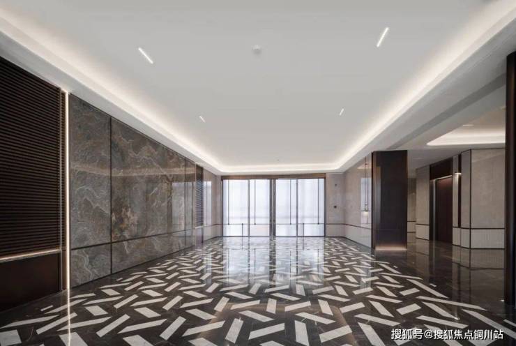 比如地下车库负一层的主车道采用全吊顶,搭配水磨石地面;又比如双入户大堂,大手笔遴选大理石景墙、拼花石材、金属屏风……全方位演绎温润与奢华。