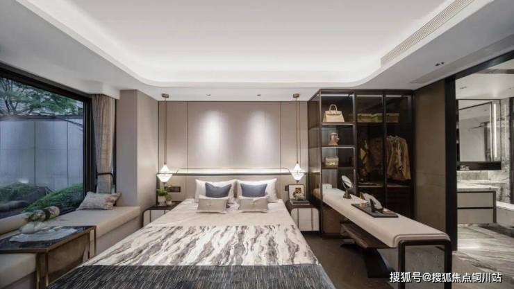 南向三个卧室全都带独立景观飘窗,约25㎡的主卧,不仅是包含卧室、衣帽间、主卫的“豪华套房”,更是创新性地做出了转角景观飘窗——让未来业主轻松实现“窗前临园,枕梦而居”。