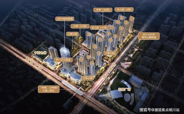包括大比例的公共绿地、口袋公园,自带约11万方商业和社区商街,也囊括了从幼儿园到初中的12年教育硬件,以及高约200米的地标写字楼。是一个具备内生驱动力的成熟型超大社区。