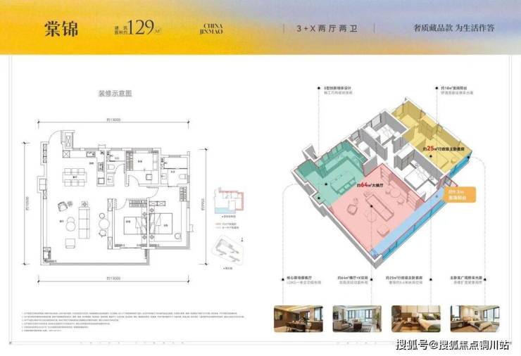 129㎡:南北双观湖,3+X房两厅两卫,63㎡LDKG设计,6.2米横厅,25㎡全景270°观湖主卧套房,9.2m跑步阳台链接次卧。