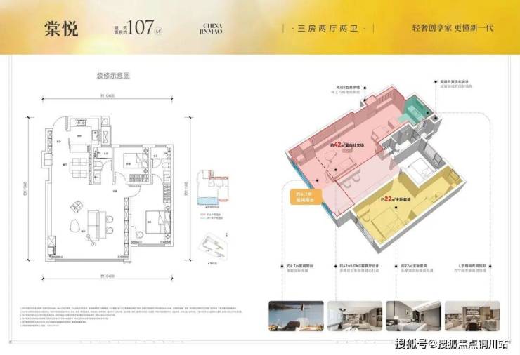 107㎡:南北双观湖,2.4M南向全景阳台、23㎡南向主卧,6.7m大开间,烟道外置全景落地窗交付