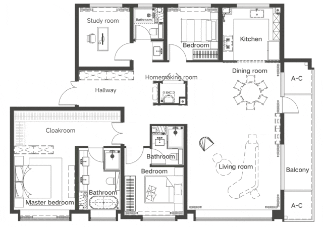 四间卧室又通过中间的走廊巧妙分隔,非常适合多代同堂家庭使用,确保不同作息的家庭成员互不干扰。