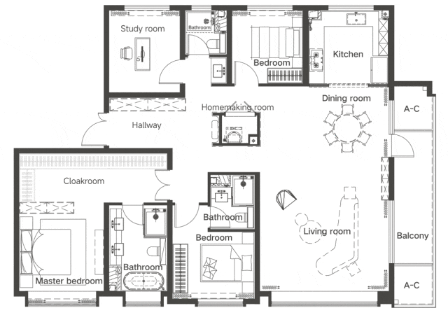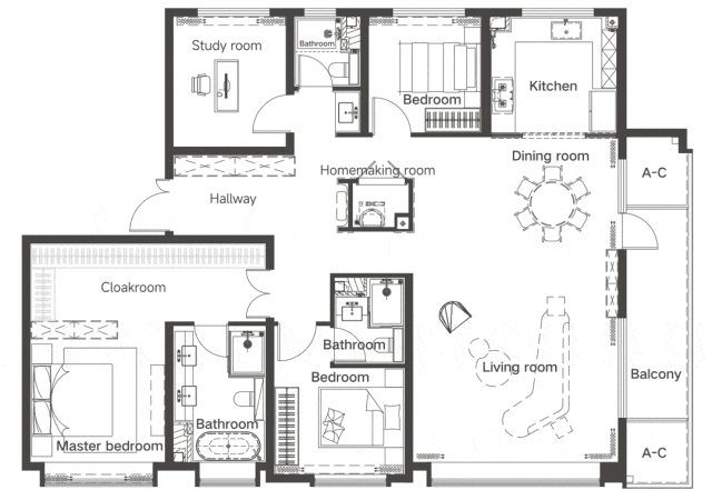 因此,这套四室三卫的户型,也可称作“2.5套房式设计”。