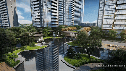 27号楼的边厅户型,从餐厅外的开敞式阳台向下望去,正好是景观中轴上的“芳兰翠影”。