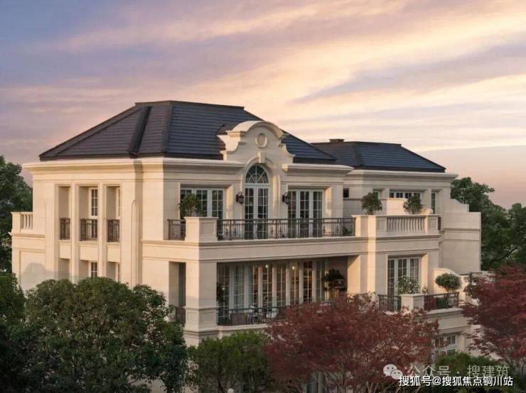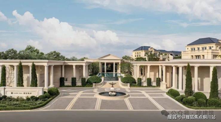 1. 色调纯净,度假美学:立面以浅暖米黄石材为底,点缀金属、玻璃,焕新法式奢华艺术气质。罗马柱与宝瓶柱阵列、隽永雕花,凝练地中海浪漫神韵,恢宏典雅。
