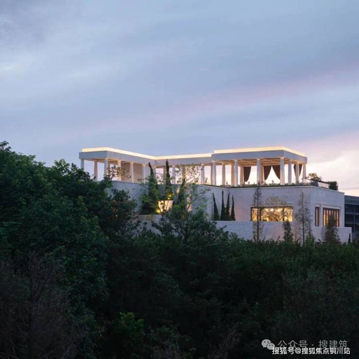 三楼景观瞭望台设置悬挑9米的无边镜面水池,被法式浪漫的柱廊环抱;向南望去,群山连绵,天际线高低起伏,美不胜收。每到傍晚,太阳回到这里,带来满池的霞光,让人忘却烦恼,沉醉于这份恒久的美丽之中。