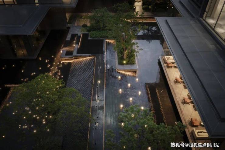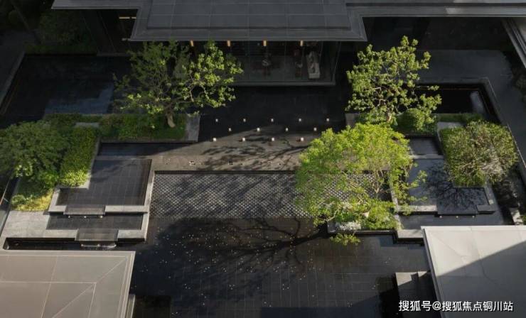 水体包裹菱形面,晶莹斑驳,似水柔和如绢布滑落,双影跳泉在高低层级不同的绿化环境内灵动跳跃,形成合院视线焦点,将绿意与水的灵性在温和中饱含力量。