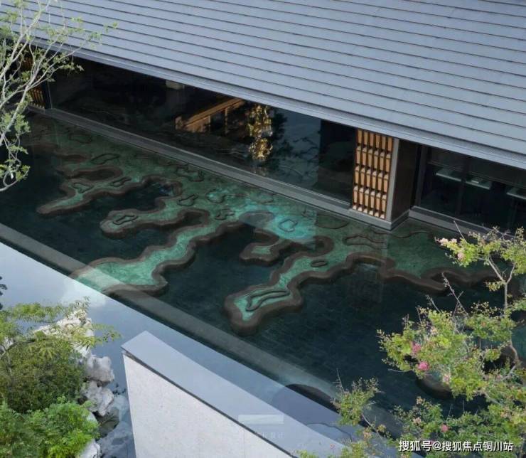 池底以手工拼贴的深色片岩模拟天然水系质感,