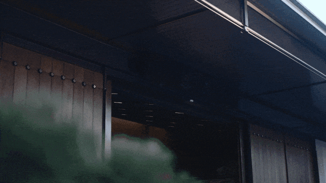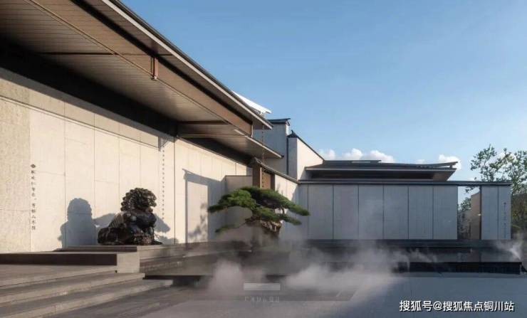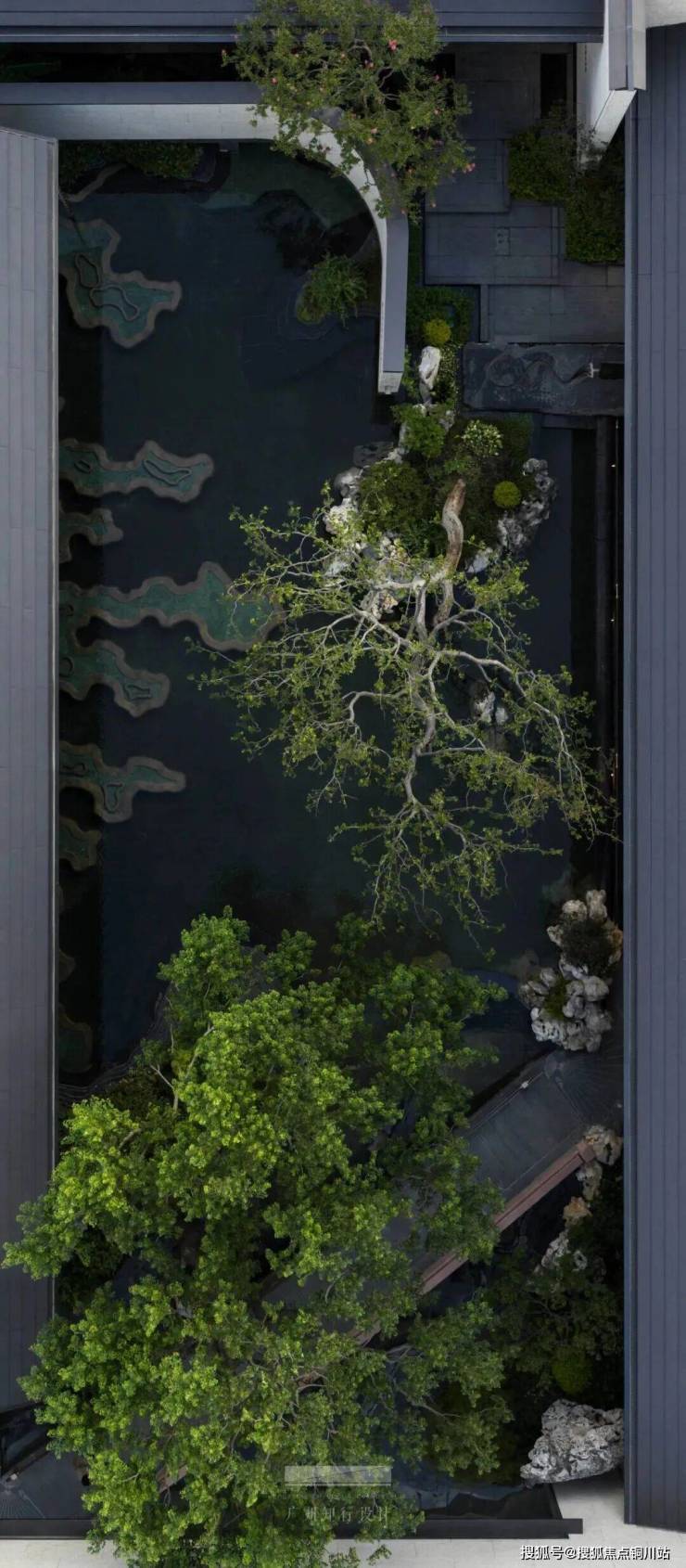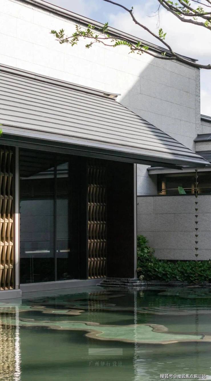 水庭左侧,一道弧形景墙如素绢轻展,悬浮于水面上。