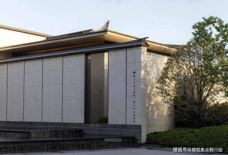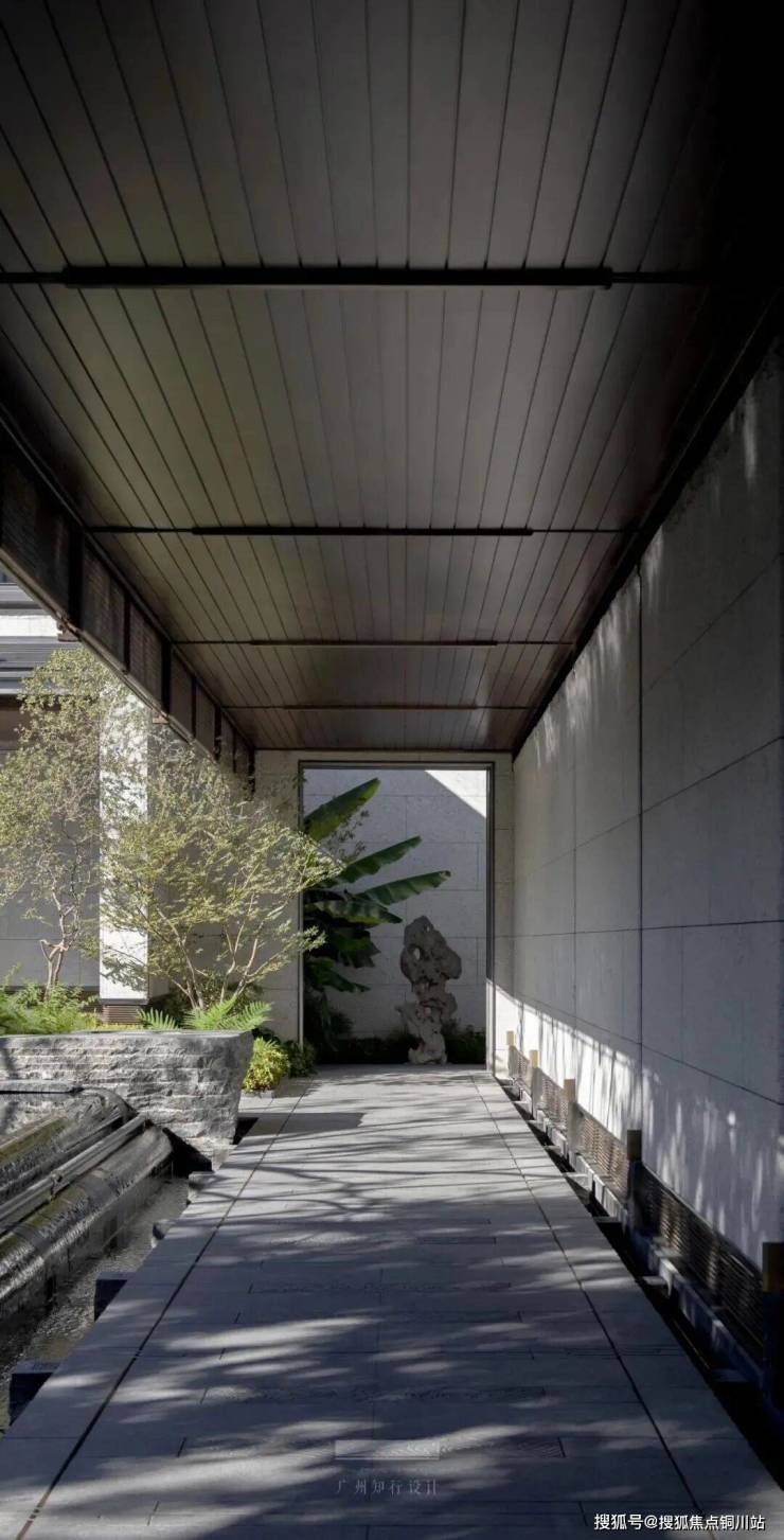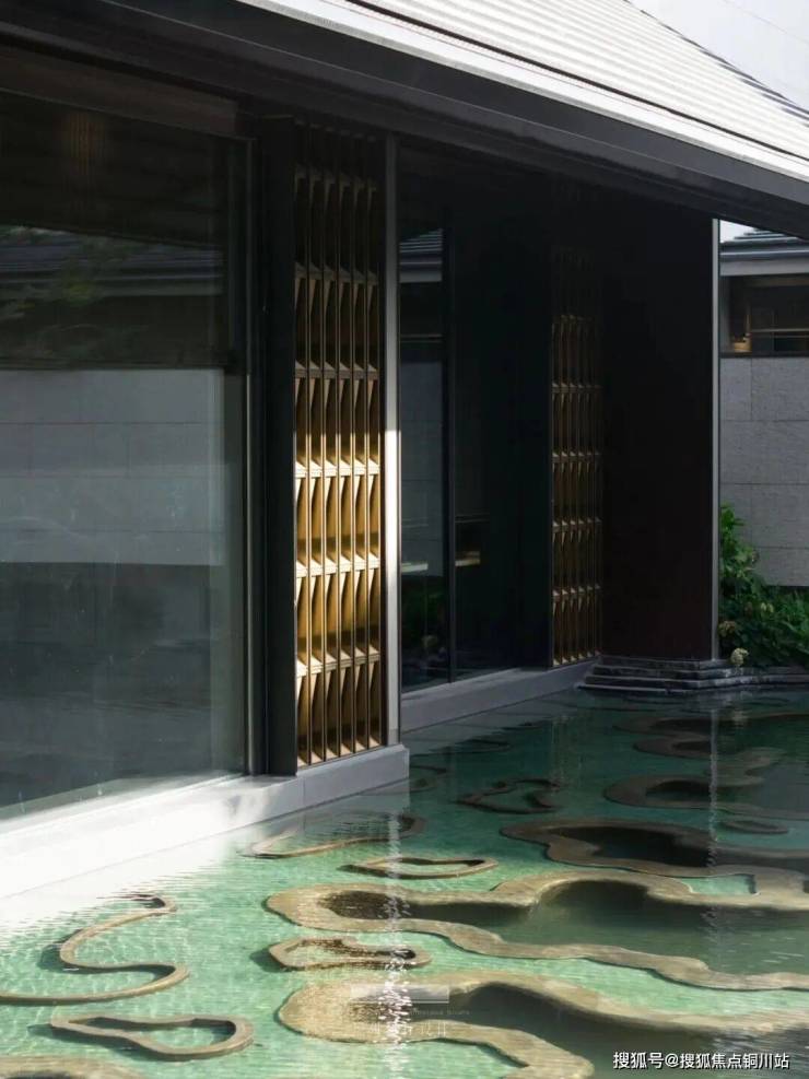景墙端头内嵌的铜质水槽道薄水如银丝跌下,