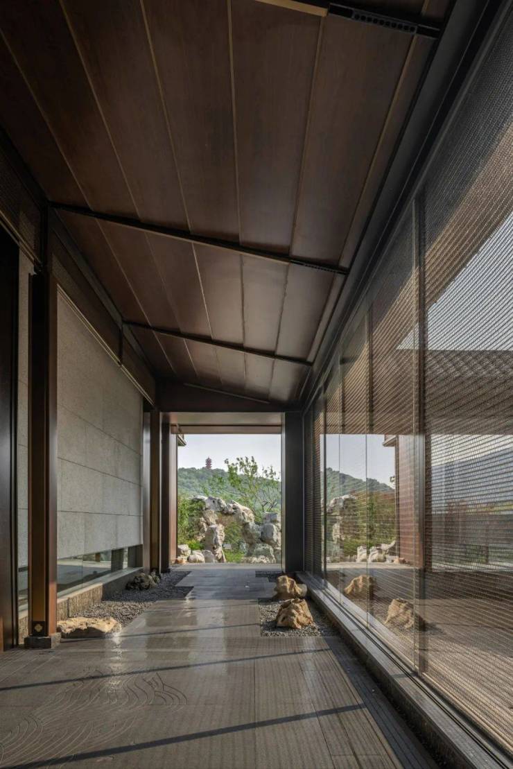 游廊设计灵感源自无锡寄畅园的“清蘌回廊”,廊墙之上开凿圆形墙洞,水底以宋代米芾《研山铭》为蓝本,采用白玉嵌金工艺铺就,既传承了文人赏石的雅致传统,又通过现代技法赋予水景金石韵味,负阴抱阳,虚实相生。