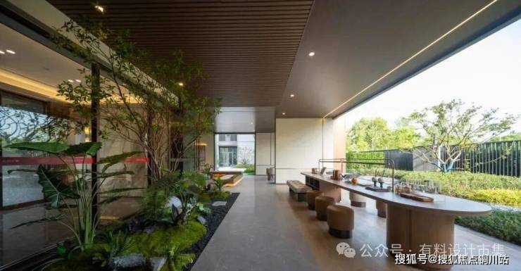 设计团队以“漂浮的无限山海”为灵感,将临海独特的山魂海韵与文人的雅致风骨,凝练于现代建筑与景观之中。主入口建筑立面选用沉稳的印度蓝石材与精致的暗金色金属型材,线条简洁流畅,于光影变幻间勾勒出“景雅大气”的现代风骨。