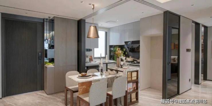 餐厅使用玻璃移门,既有开放性厨房的空间效果,又能避免油烟对客厅的影响。