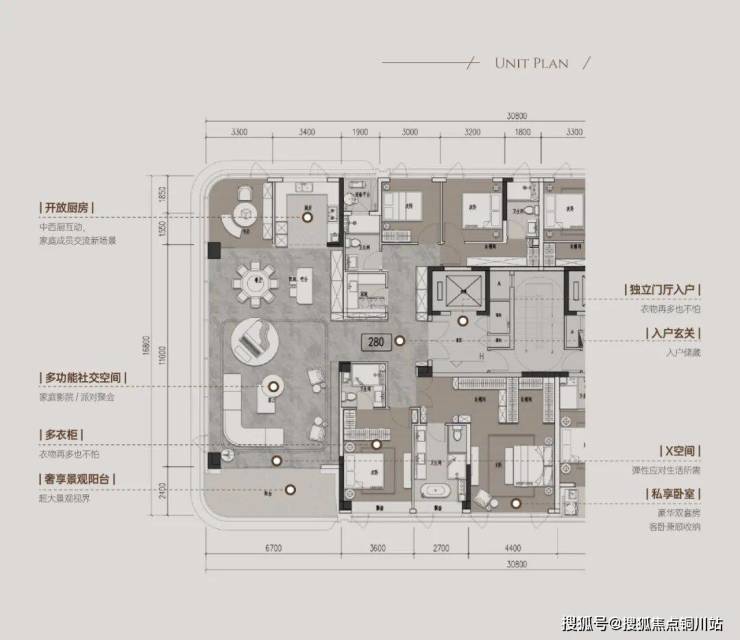项目全盘规划188-288㎡大平层户型,以纯粹面积段确保圈层统一性,精准回应高端客群需求。户型设计打破传统边界,如280㎡“三面端厅”格局,以开阔空间视野与功能布局,重塑当代大宅体验。