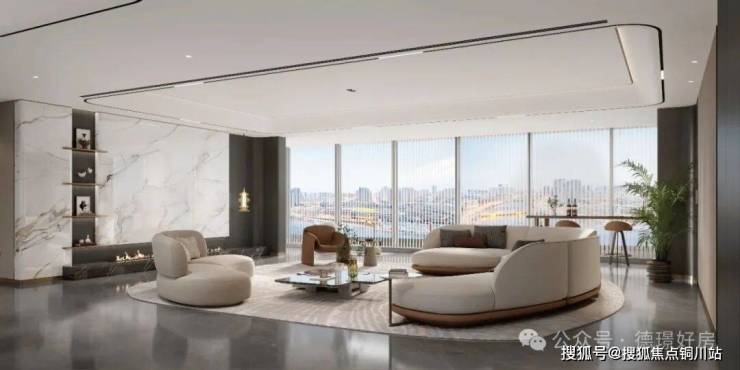 ◎IMAX超大会客厅| 约8.4m面宽的大客厅,连接约11.9m转角圆弧形阳台,透过落地窗能俯瞰超万方中庭景观,尽显豪宅生活风光