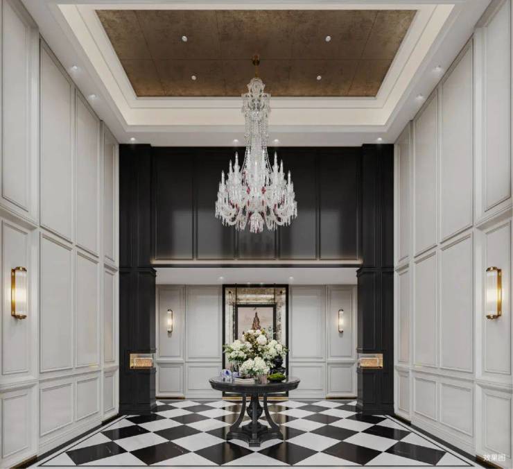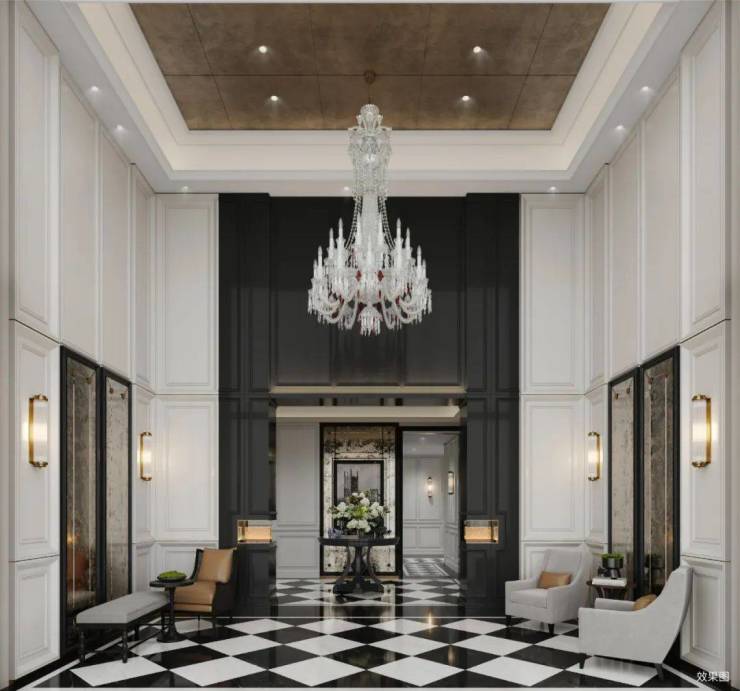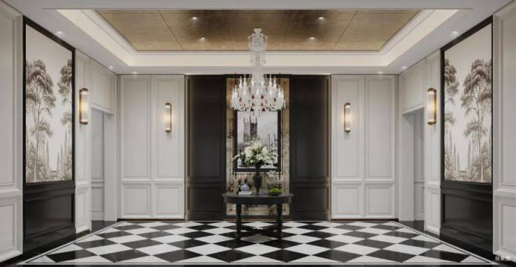与首层大堂的设计风格相呼应,电梯厅选用黑白格瓷砖拼花、仿铜不锈钢踢脚线、白色烤漆板等形成艺术渲染,凸显府邸主人的品位。