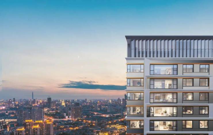 外立面采用公建化的第三代新产品形制,通过香槟金色铝板与大面积玻璃的搭配,让南向立面的视觉效果更轻盈、通透。