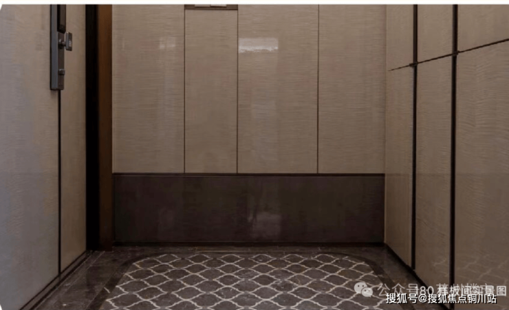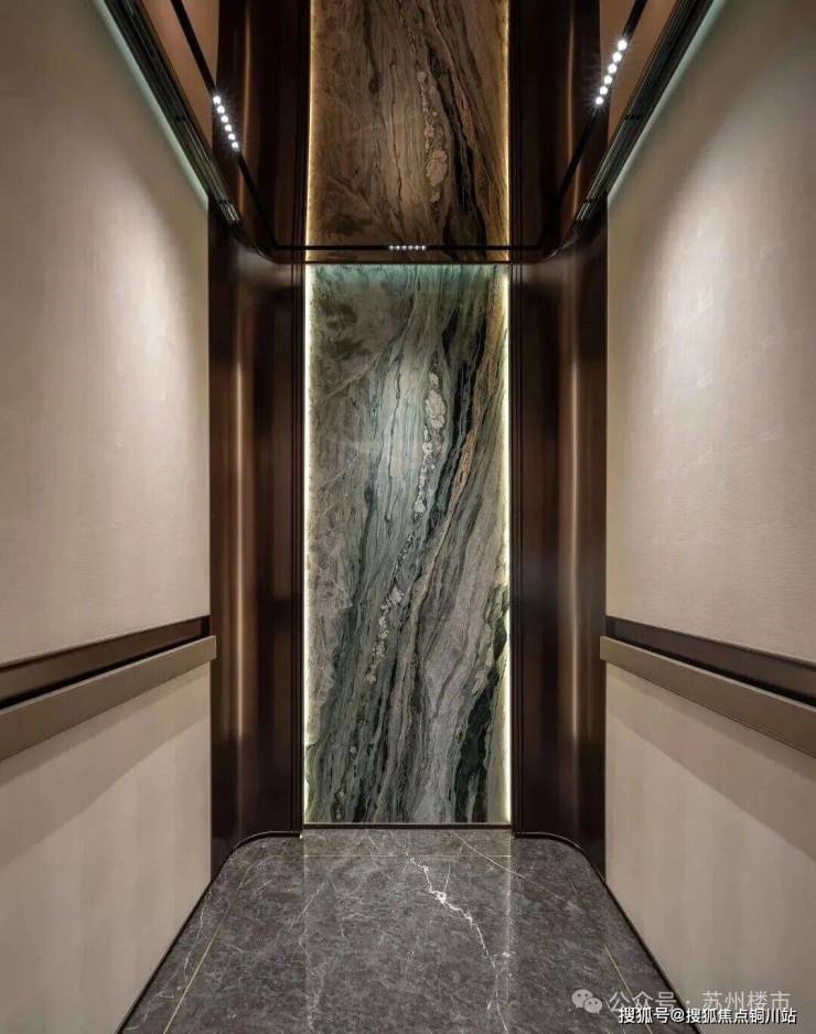 这份奢华氛围还延续至首层电梯厅(仅约180㎡首层电梯厅),整体以沉稳古铜色为主,电梯厅门采用蚀刻工艺高定纹案细节,厅内臻选青玉色调奢石,带来视觉与身心的双重奢享。