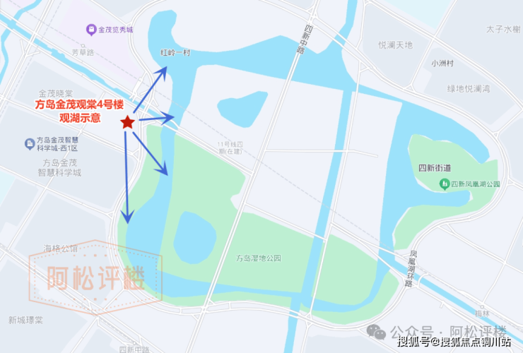 从平面图看,方岛金茂观棠4号楼高层位于项目东北角,南面是小区园林及6层洋房,北向是城市道路、览秀城(在建)等。