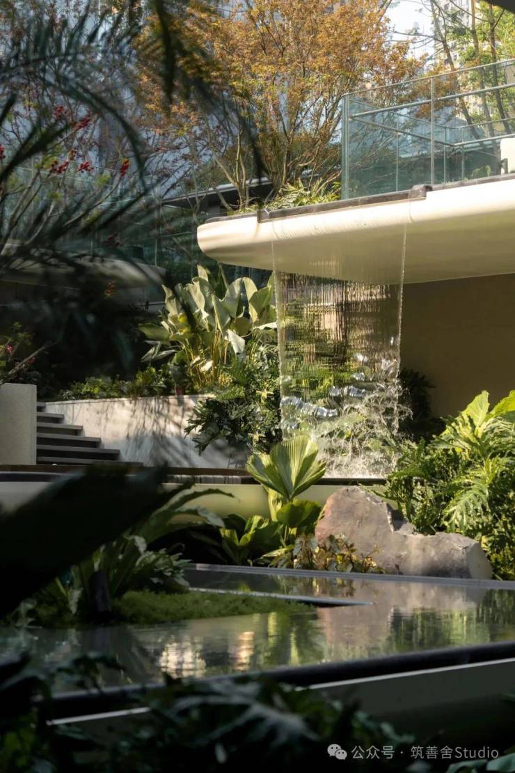 园林景观上嘉宸独辟蹊径,在有高差的地块上,摒弃了传统的下沉式庭院设计(面临江景,何必将视野局限于狭小的庭院)。取而代之的是,采用悬浮平台与错落叠水,巧妙地融入枫叶与乌桕,使原本平铺的庭院立体化,打造出园区独特的“三维照壁”,更构筑了一条别致的悬浮归家之路。