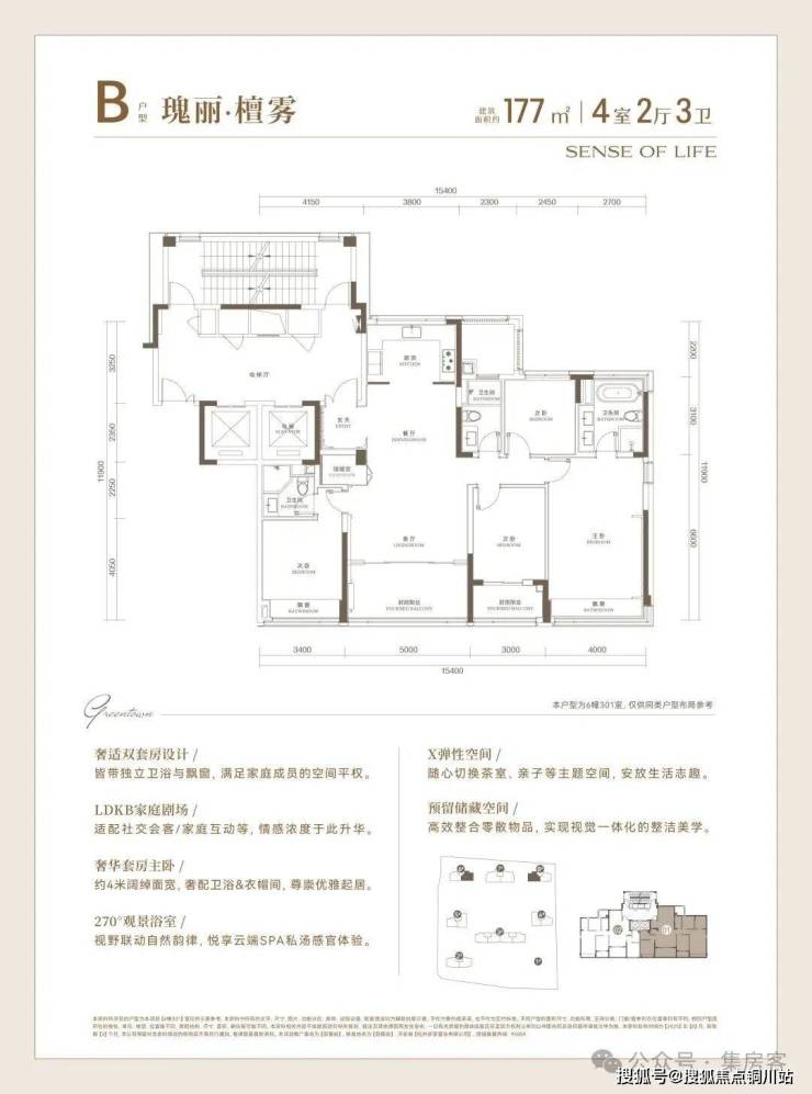 建面约177㎡的四房,保持四开间南的格局,但尺度进一步拉大,将阳台包入之后,整个LDKB公区会放大到约40㎡。