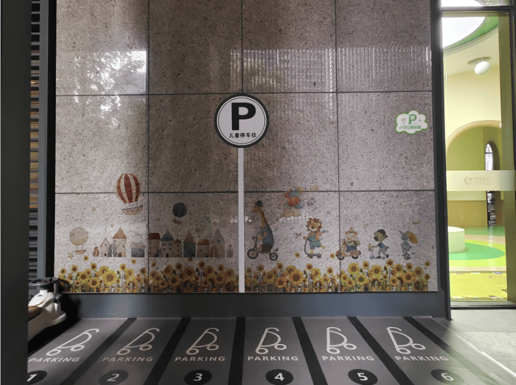 如风雨连廊下专门设置了一处儿童停车场,孩子们的滑板车、溜溜车、摇摇马都能聚集在此,秩序感油然而生。