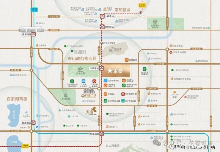 直线距离约200米即达5号线文靖路站,与1、3、S1号线无缝换乘,自成枢纽中心;同时汇聚东山公园、江宁医院三甲医疗、优质教育等多元生活中心。