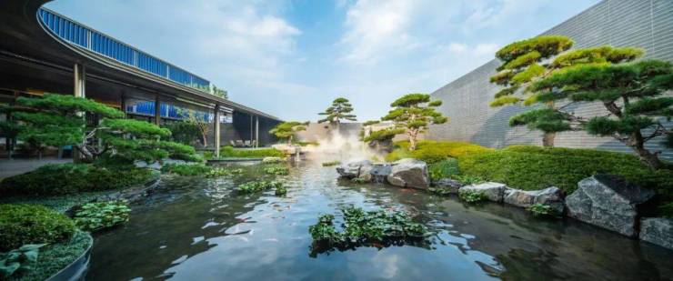 两块巨石叠成元宝形,叠瀑飞流直下,高矮错落的奇松点缀左右,游廊下还嵌入一个微风吹拂的休闲高台。