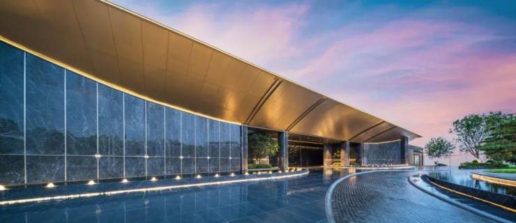 迎面约14.5米宽、4.9米高的液态大理石景墙,由全球罕见的西班牙马里奥纳灰奢石打造。