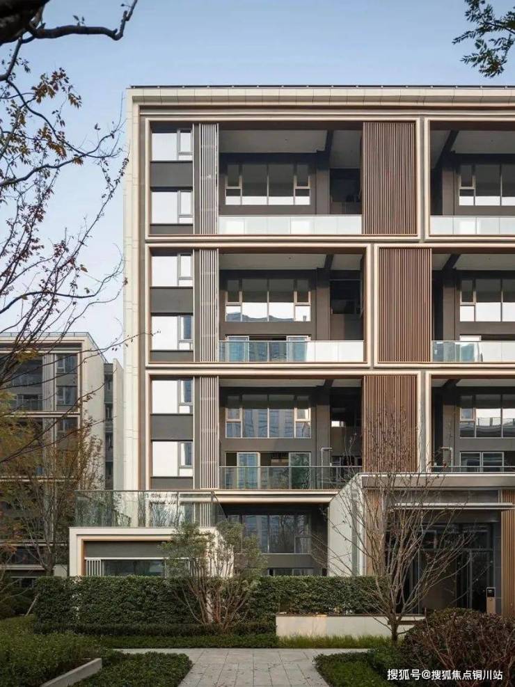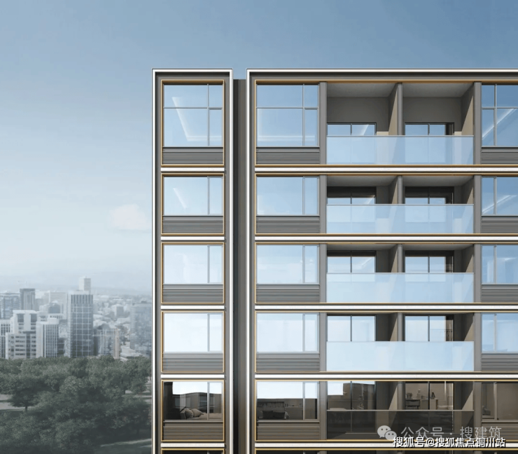 比如,北京悦府在立面表达上,汲取古建“三交六椀”的窗格形制,反复比选,勾勒立面骨架。借石材、铝板、玻璃多材质叠加构成,由远及近、由粗至细,层层细节涌现尽显精致华贵。