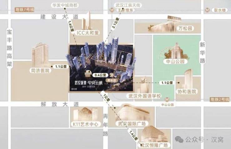 武汉城建·中央云城位于武汉市江汉区青年路(地铁2号线青年路站D出入口旁),地处汉口内环核心区域。项目距离内环线约500米,属于正内环地段。