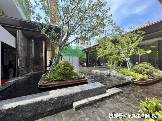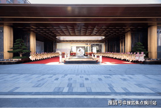 主入口的龙鳞顶天花,阵列排布自带气场,金属龙鳞肌理在光影下熠熠生辉;其下“泗水回堂”的雨幕水景,循天圆地方的规制,聚水纳财;中央平安扣造型的“玉璧”,藏风聚气,隔绝喧嚣;两侧单方造价8000+的奢石景墙,搭配日本同纬度移植的迎客松相得益彰。
