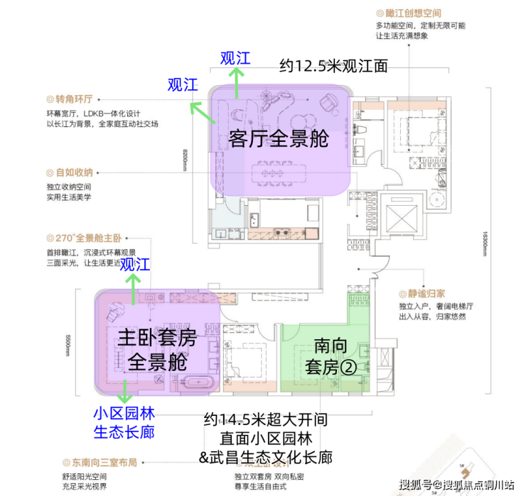 开创性双全景舱设计:这个户型在客餐厅和主卧都做了全景舱设计,动区实现LDKB一体化环幕观江,主卧做到三面采光+广角视野。