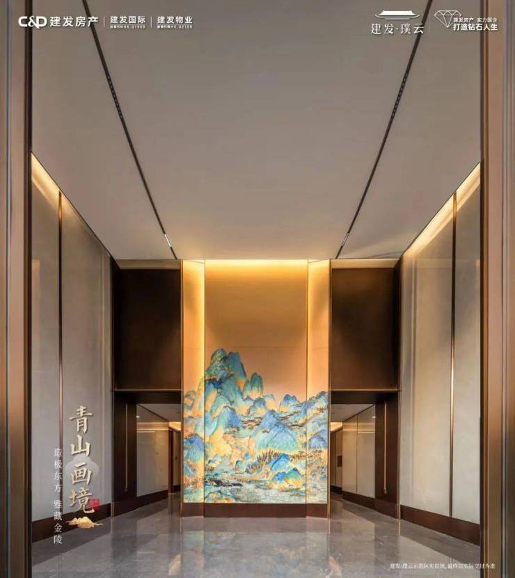 入户大堂,有非遗掐丝技艺打造的珐琅幻彩玻璃,一幅“千里江山图”徐徐展开,加上帷幔吊顶+仿玉石大岩板+金属线条等,文化大宅底蕴拉满
