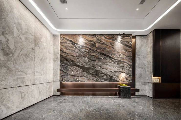 似乎想要把品质感“武装到牙齿”,地上地下双入户大堂内部的墙面摈弃了传统的涂料,大面积采用了明亮且纹理丰富的灰色石材,搭配独特纹理的威尼斯棕石材,全方位营造出尊贵典雅的空间氛围。