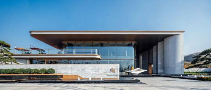 更夸张的是,逸庐不仅在实现建筑色温、材料的丰富性的同时,甚至在侧面山墙面,也用上曲面玻璃等材质,呈现出连侧面都惊艳的流线型立面,让逸庐的每一面都成“封面”!