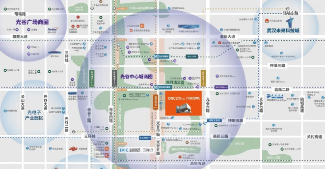 大型商圈:周边商业氛围浓厚,被多个大型商业体环绕 。距离项目几百米处,有正在建设的光谷五路地下空间走廊,官方回应高新二路以北预计 2024 年 6 月完工,高新二路以南预计 2024 年年底完工 。此外,规划中的龙湖天街也近在咫尺 。车行 5 分钟可达已开业的武汉大悦城,10 分钟内可至首创奥特莱斯、山姆会员店 。1 公里半径范围内,还有在建的瑞安 “天地系” 光谷新天地商业街 。