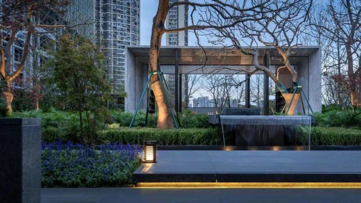 中央聚场结合美国建筑大师路易斯康落日广场的设计语言,四水归堂,水流静邃,8棵榉树矩阵,以中西式结合的设计手法,既显大气,更显格调。