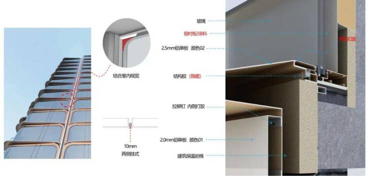 门窗系统升级为创新组合窗类幕墙系统,不仅强化了公建化住宅的现代风格,更在细节设计中彰显幕墙的独特美感。通过巧妙扣盖藏胶、引入工厂预制单元板,以及采用同色胶工艺,打造出更加和谐统一的立面效果,全面提升整体视觉质感。