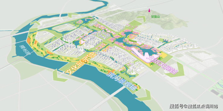 朗园所在的武汉甘露山文创城,规划形成“一纵一横一核”的三轴空间结构:纵贯滠水河至甘露山的文化展示轴,串联千年历史长廊,让居者漫步中感受文化传承;横贯滠水河岸的滨河生态轴,打造乐活滨水走廊,提供自然宁静的休憩空间;串联中心区的文旅活力轴,则构建文旅中枢,融合多元场景,丰富生活体验。