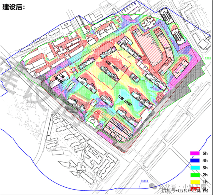 整个项目呈现出北低、南高的建筑趋势,这对于采光会有一些影响,结合项目光照分析图也能看到,2小时内日照的颜色分布范围还是比较多的。