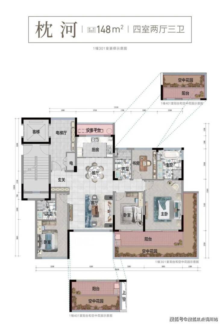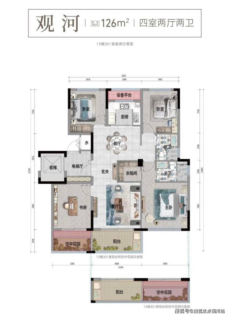建面约126㎡方正四房:约6米挑高空中花园,以奇偶错层设计,实现采光与通风的飞跃。