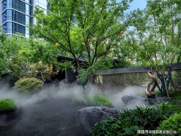 后场核心庭院:以“悬浮之境,自然诗学”为理念,于中庭水林苑之上构筑一方抬高的茶室。其构筑体量以轻盈之姿悬浮,与景墙形成浑然一体的雕塑感,塑造出奢雅、有序且极具艺术感的静谧空间。林居、镜池、水苑在此自然交融,生活被彻底浸润于风景之中。