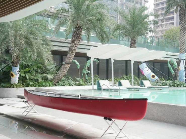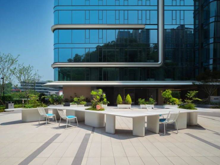 现在,在每个楼栋下面,你能够看到植被绿意被引入架空,搭配上简约陈设,将美学属性拉满,这些架空多数不并强调具体功能,一切都是惬意、放松、自由自在的。
