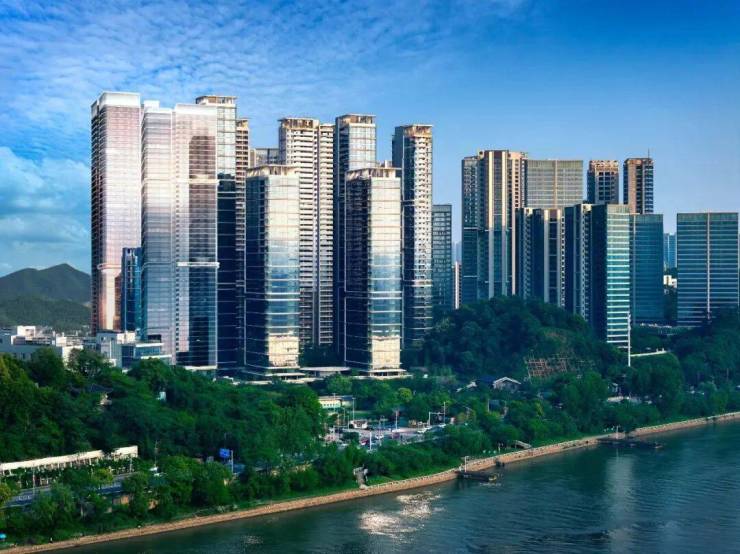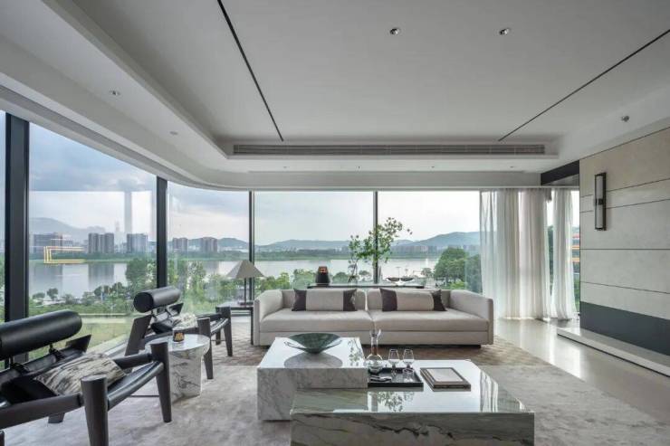 不同于直角玻璃的生硬,弧角让建筑线条更显优雅流畅,因为没有转角柱,270度的景观视野能将山景与江景无缝衔接。