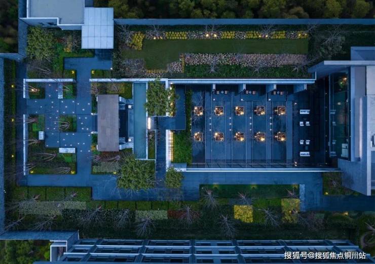 在会所一楼的北侧,可以俯瞰会所下沉庭院全景,以美国李维斯广场为灵感,设计打造了中心水院、飞瀑水景,下沉庭院里乌桕林立与水景交相辉映,既满足了生活调性,也给予业主悠然闲适质感,赋予浪漫的情调。