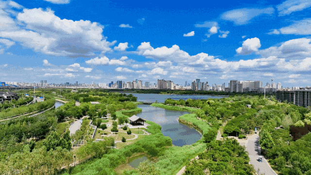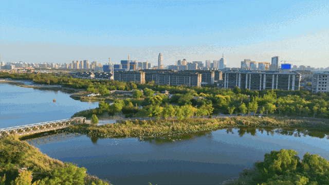 晨曦初露,晨雾还未散尽,如镜的湖面稳稳托起初升朝阳,金色的光粒如碎金般倾洒在岸边原生柳林,蝉鸣与蛙声在氤氲水汽里相互和鸣,奏响一曲自然的乐章;正午时分,暑气蒸腾,两侧的古木撑开如盖浓荫,藏起一方清凉天地。漫步湖边,只见“接天莲叶无穷碧,映日荷花别样红”。睡莲池里涟漪层层,与对岸廊柱相映成趣,仿佛将卢瓦尔河谷的浪漫风情悄然移植到了津门大地;夜幕降临,暮色四合,偶尔有白鹭轻盈掠过水面,惊起的涟漪瞬间搅碎晚霞与建筑轮廓交织的倒影。每一片荷叶舒展的姿态、每一缕晚风拂过的轨迹,都在静静诉说着城市中难能可贵的自然奢享。