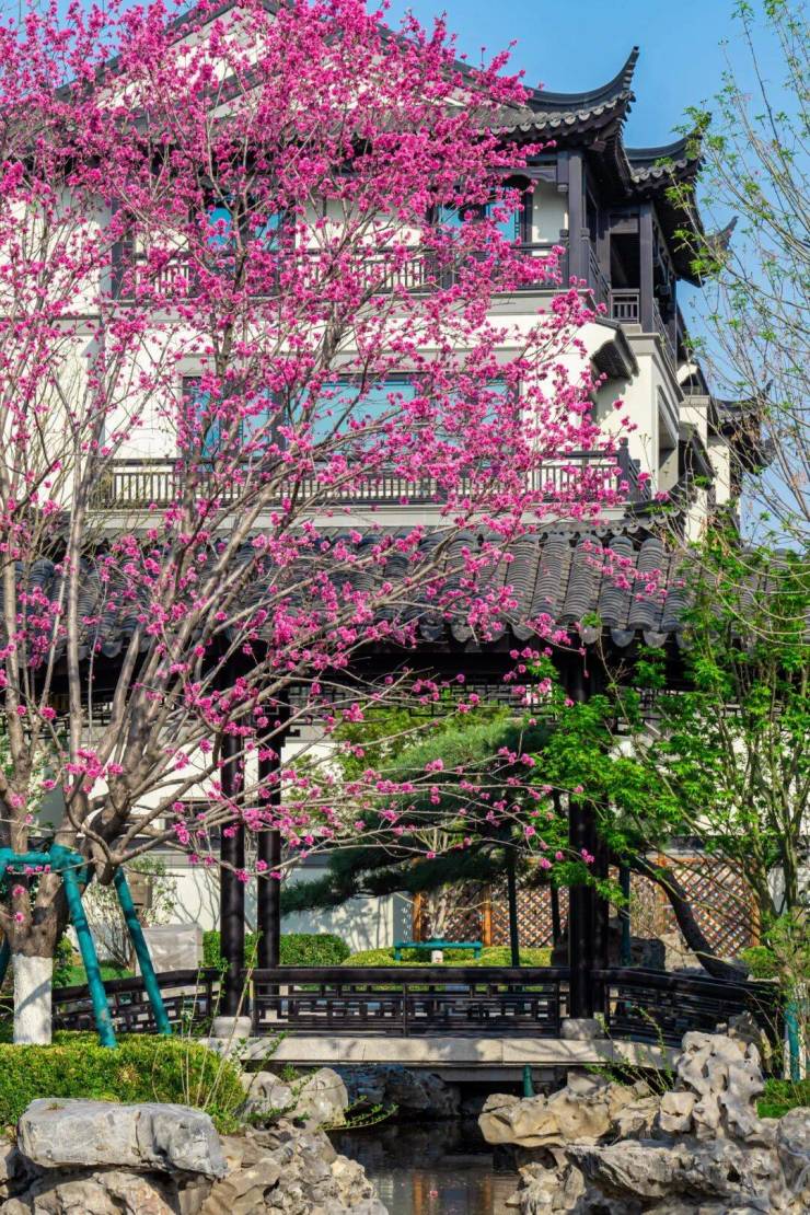 园中臻选多种名贵观赏植物,各有风姿与意趣。极为稀有的“菊花桃”是园中的点睛之笔,宋代诗人朱翌曾以“菊花忽作桃花面”描摹其独特花型,清代诗词更将其比作“红粉佳人赛美貂”,花姿之妙可见一斑。中国传统国学圣树 “菩提树”亦在此扎根,高大雄伟、树冠如盖、古意盎然。作为智慧的象征,它承载着心灵的隐逸之思,见证着岁月轮回与生命流转。